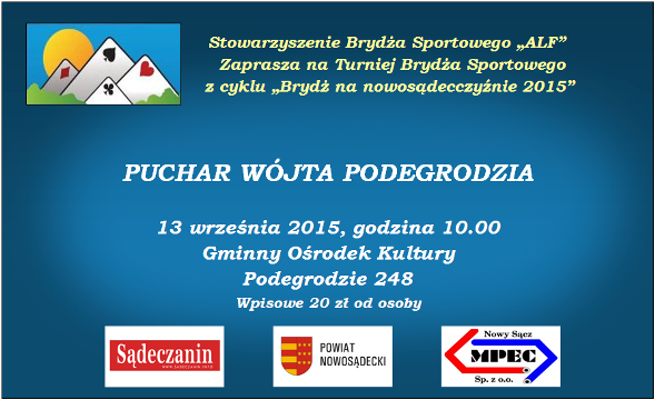 W czwartek 17 września odbędzie się w tarnowskim Domu Studenta przy ul. J. Słowackiego 7 o godz. 17.30 kolejny turniej integracyjno-szkoleniowy. Zapraszamy zarówno młodzież jak i ekspertów znających Strefę i WJ. O udziale ekspertów decyduje WK - im wyższe tym większa szansa gry z juniorem. Pozostali także zagrają. Pary zostaną skojarzone w drodze losowania. Turniej na zapis średni (Cavendish Uśr. z Pajączkiem).