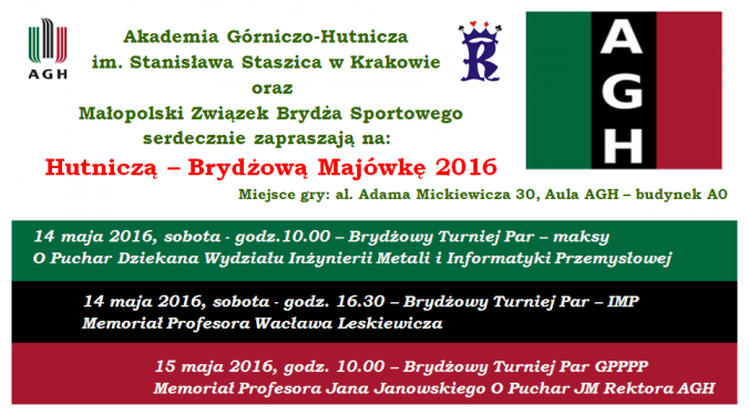 Gramy w Nowohuckim Centrum Kultury, al. Jana Pawła II 232. Początek, sobota 23 kwietnia godzina 9.45. System - barometr 15 rund po 3 rozdania, do końca bez powtórzeń. Godzinna przerwa obiadowa około godziny 14.30. Przewidywane zakończenie zawodów około godziny 18.30.