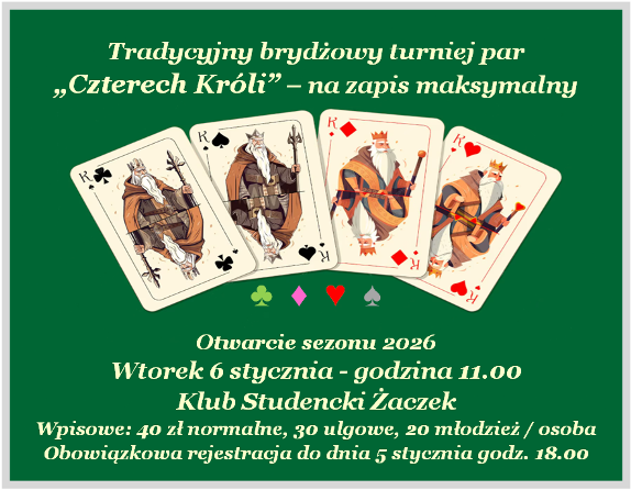 Z przyczyn niezależnych od MZBS turniej poniedziałkowy 15 grudnia - odwołany. Zapraszamy na środowy barometr